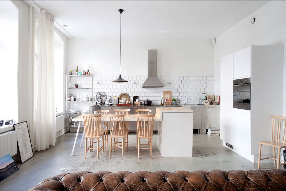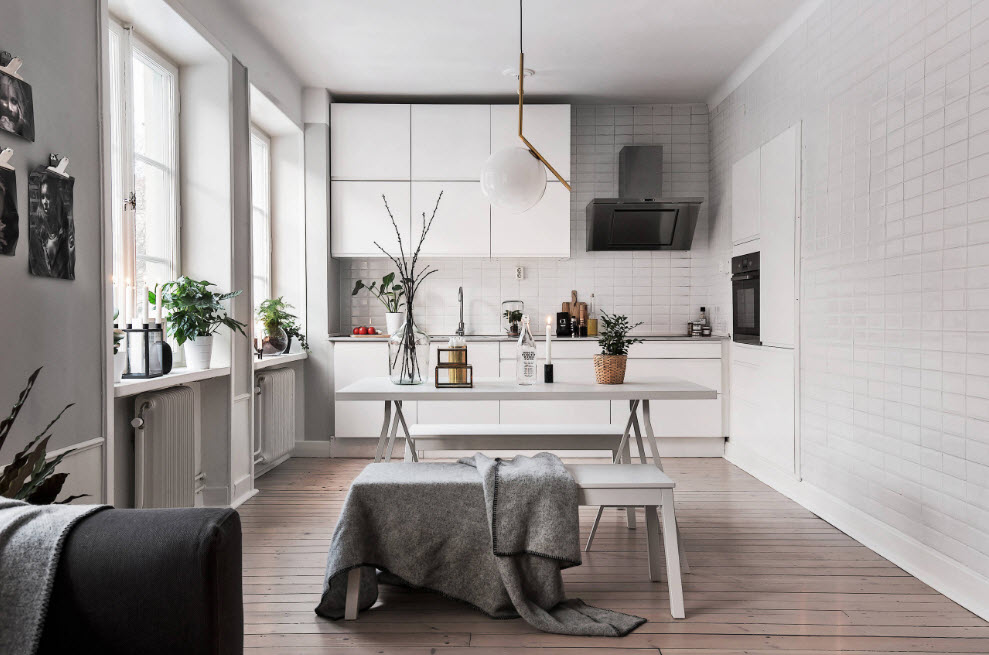 - Скандинавский. Главное отличие — любовь к белому цвету. Стены и потолок, мебель, декор — все может быть белоснежным. Поэтому прекрасно подойдет даже для маленьких кухонь.