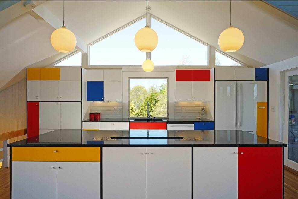 Некоторые сочетания зелёного и белого воспринимаются особо гармонично. Например: белый фон (гарнитур, техника, стены). Акценты ярких, почти кислотных цветов: стулья, занавески, светильники, посуда.