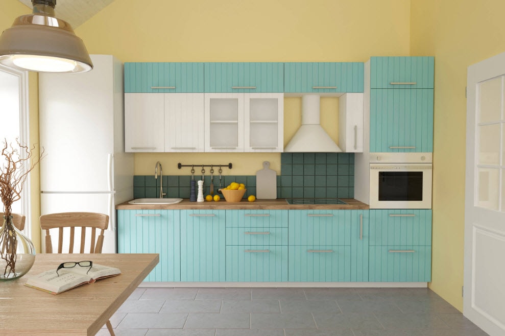 Ещё одно удачное сочетание – это приглушенно-зелёный фон (мебель). Постепенный переход к более светлым оттенкам на стенах и столешницах. Мозаичный фартук с фрагментами всех оттенков. Белые занавески, техника и посуда. Такая кухня – остров покоя и домашнего уюта. В массе основного цвета даже чистейший белый будет казаться зеленоватым, как сквозь бутылочное стекло или воду.