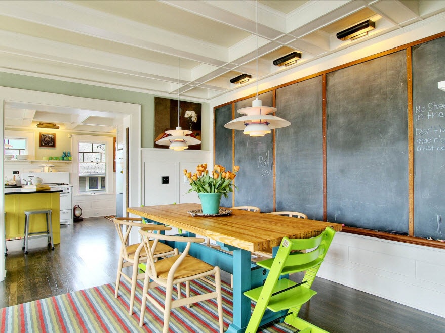 - В обеденной зоне поставьте большой прямоугольный или круглый стол из массива дерева.