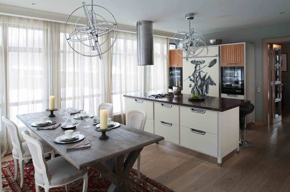 Второй аспект, который никак не обойти — это эксплуатационные особенности кухонного помещения. Какой бы мощной вытяжной системой ни была снабжена кухня, она всегда является источником распространения запахов и испарений. Некоторые из них способны впитываться в текстиль мебели, портьер, других деталей интерьера, что становится совершенно неприемлемым для некоторых владельцев жилья.