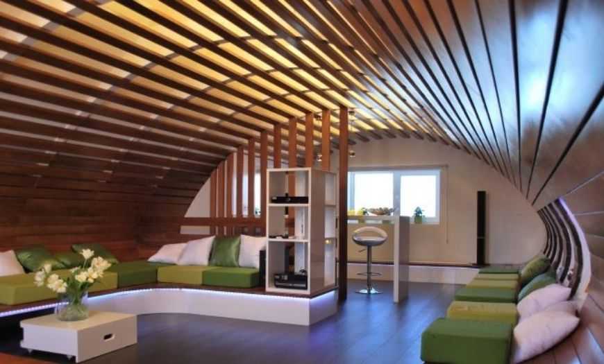 Отдельно хочется остановиться на мансардной части деревянного дома. Здесь можно организовать спальню, детскую комнату, гостиную или зону для отдыха, поставив бильярдный или теннисный стол.