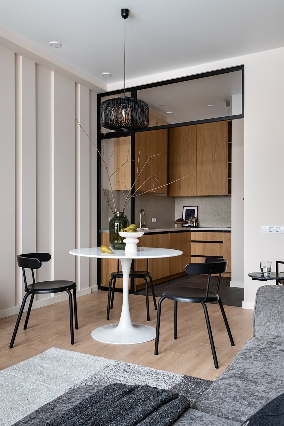 Светлые породы дерева помогают создать лёгкий и воздушный интерьер кухни-гостиной