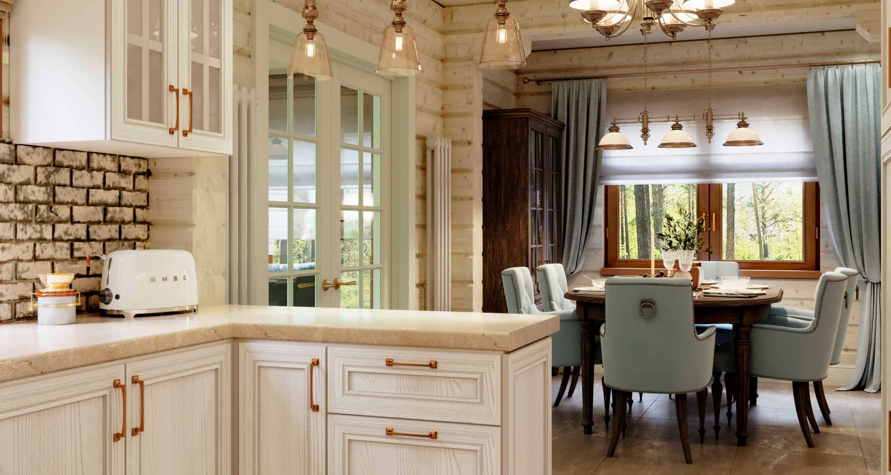 При планировании интерьера кухни в деревянном доме нужно учитывать несколько моментов: