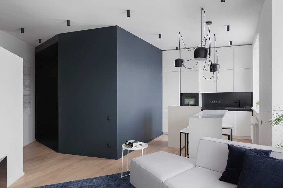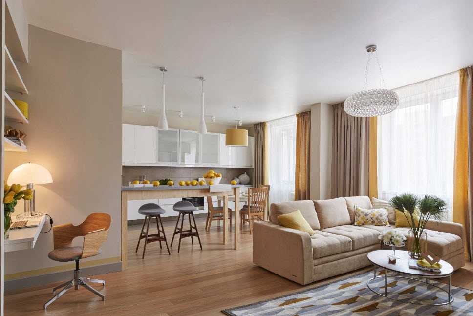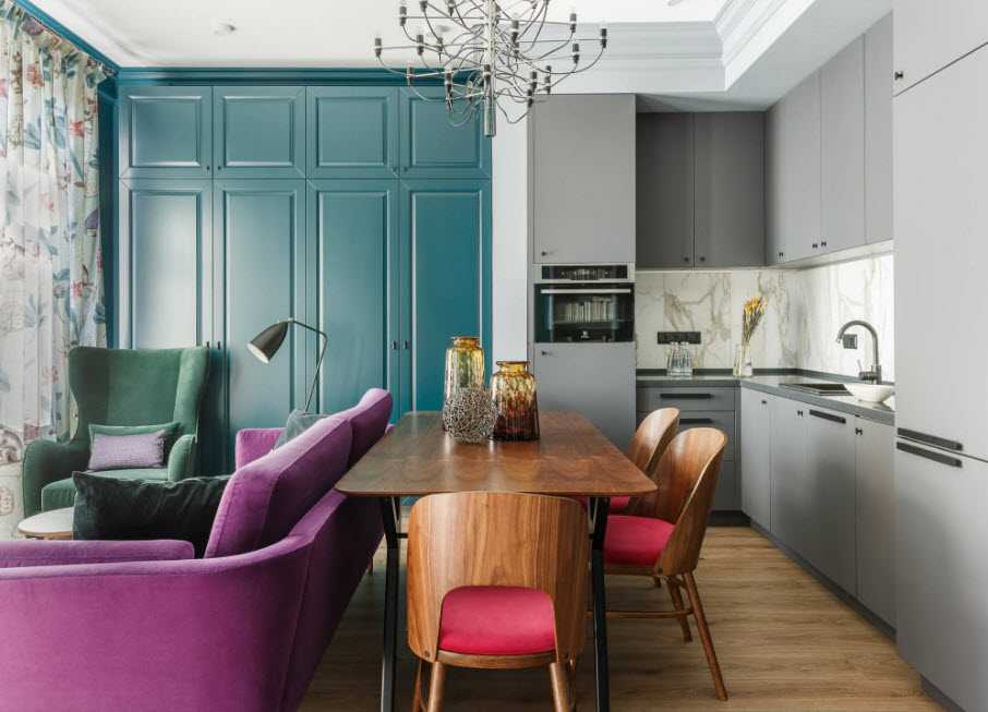 Оценить количество мебели и зон можно на основании общей площади после соединения кухни и гостиной. При выборе мебели следует учитывать форму и габариты полученной комнаты. К примеру, отсутствие большого количества острых углов обязывает собственника выбирать мебель с плавными закругленными формами.