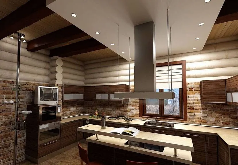 Мебель на кухне в бревенчатом доме можно расположить несколькими способами: