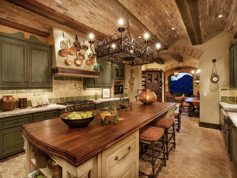 Кирпич: отделка кирпичом (или «под кирпич») выглядит старомодно, просто и естественно. Такой вариант лучше сочетать с покраской или оформлением деревом, так как полностью кирпичная кухня будет выглядеть маленькой и тесной. Кроме того, основа кантри – это все-таки дерево.