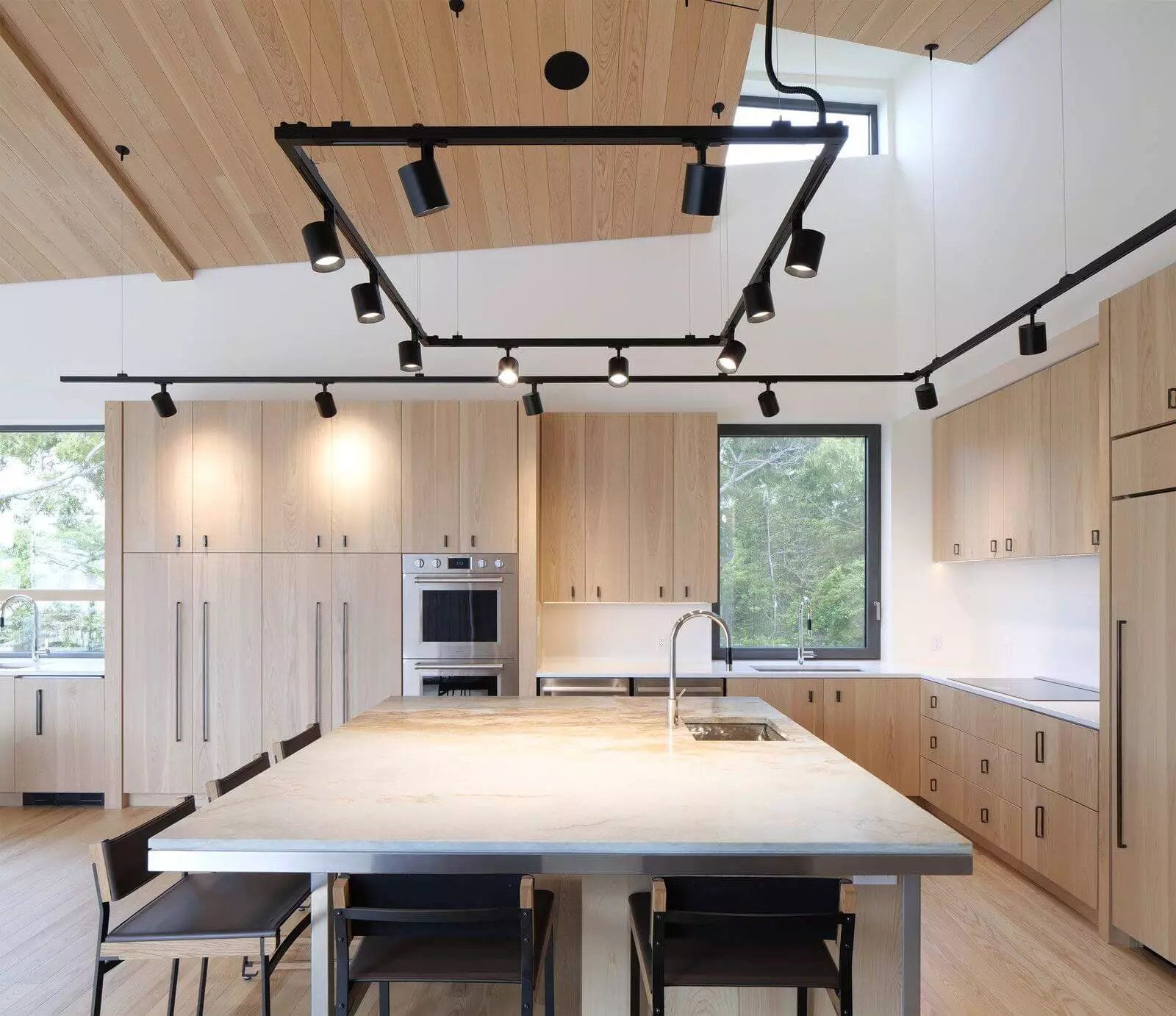 Однако наибольший интерес представляет активное использование современных высокотехнологичных систем освещения – трековых светильников, прожекторов и др. В дорогих и тщательно продуманных интерьерах в духе эко все чаще используется диодная подсветка и скрытые световые линии – это создает эффект естественного освещения и ощущение, что лучи солнца проникают сквозь ветки деревьев (в этом корпус, деревянная отделка и растения).