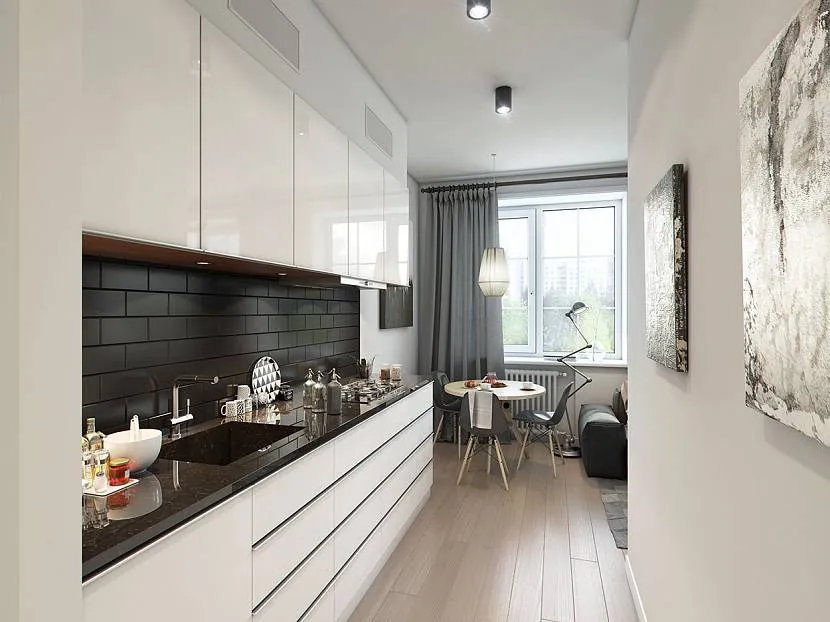 Если полный снос перегородки не входит в ваши планы, то создать стильный и функциональный дизайн кухни в хрущевке можно за счет переноса этой самой перегородки. В зависимости от особенностей планировки увеличить площадь кухонного помещения можно за счет соседней ванной комнаты, кладовки, гостиной или коридора. Такой вариант дизайнеры советуют владельцам газифицированных кухонь, и в итоге вы получите увеличенное, но при этом полностью изолированное пространство.