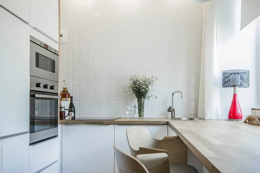 Это решение особенно важно, если в квартире нет большой семьи, а два или три человека. Как правило, такая конструкция примыкает к рабочей поверхности, перпендикулярно одной из сторон утопленной гарнитуре. Столешница небольшого бара может служить местом для еды и выступать в качестве дополнительной рабочей поверхности