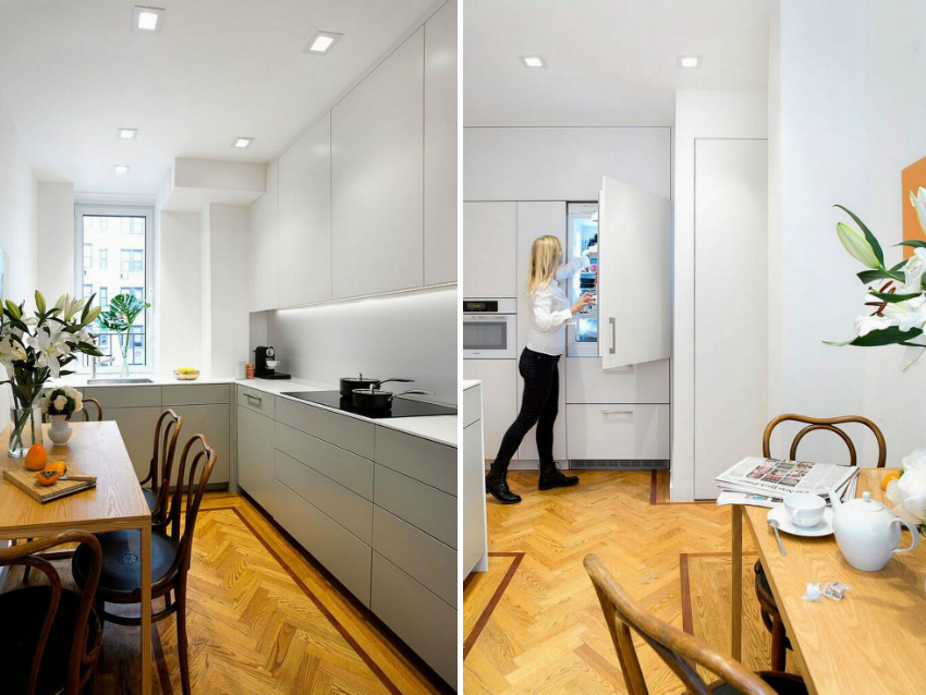 - полноценный холодильник можно поставить в коридоре. Так вы освободите существенное пространство в кухне, но за продуктами придется постоянно ходить в коридор;