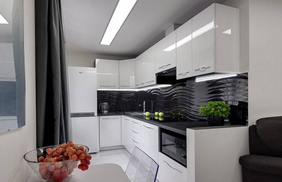 Для фасада и меблировки подбирают гладкие, светлые материалы, с эффектом глянца, чтобы визуально увеличить маленькую площадь. Следует учитывать, что тесное расположение рабочей зоны будет склонным к частым загрязнениям.