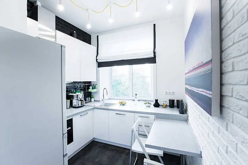 Если кухня 5 кв метров соединена с балконом или лоджией, не обязательно сносить подоконник. Его можно превратить в барную стойку.