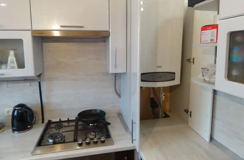Газовая колонка на малогабаритной кухне создает значительные неудобства. Колонка, выступая из стены, бросается в глаза. Но решение есть – колонку можно скрыть, используя для этих целей шкаф, который крепится на стену