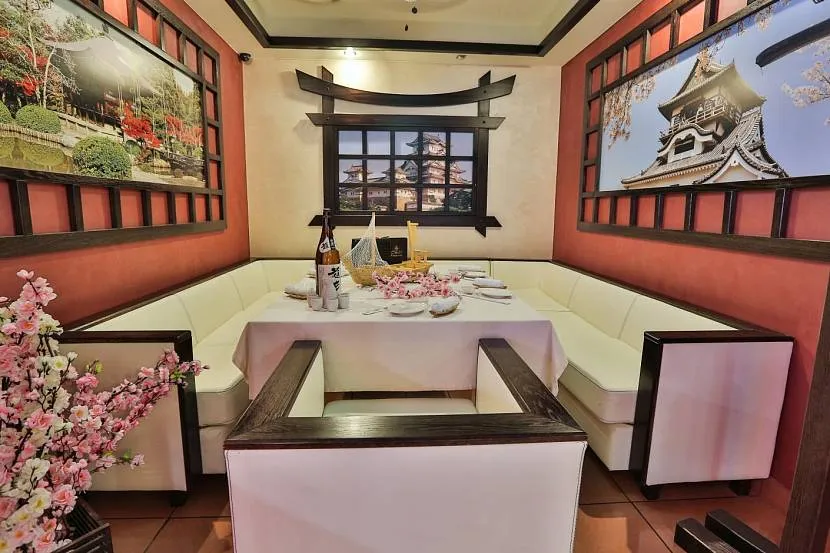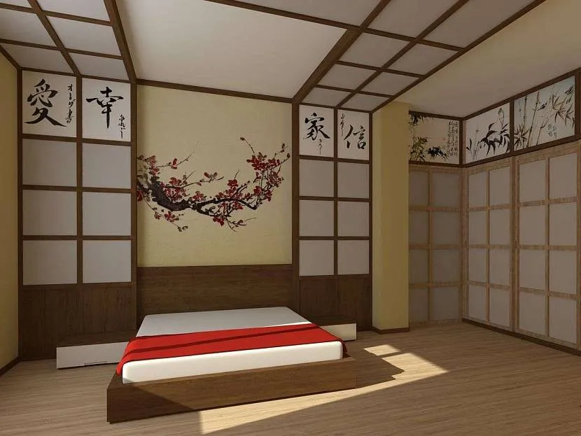 На зеркалах, ширмах, мебели и прочих элементах декора обязательно должны быть изображены различные рисунки. Это могут быть драконы, иероглифы, сакура, китаянки с зонтиками, различные цветы.