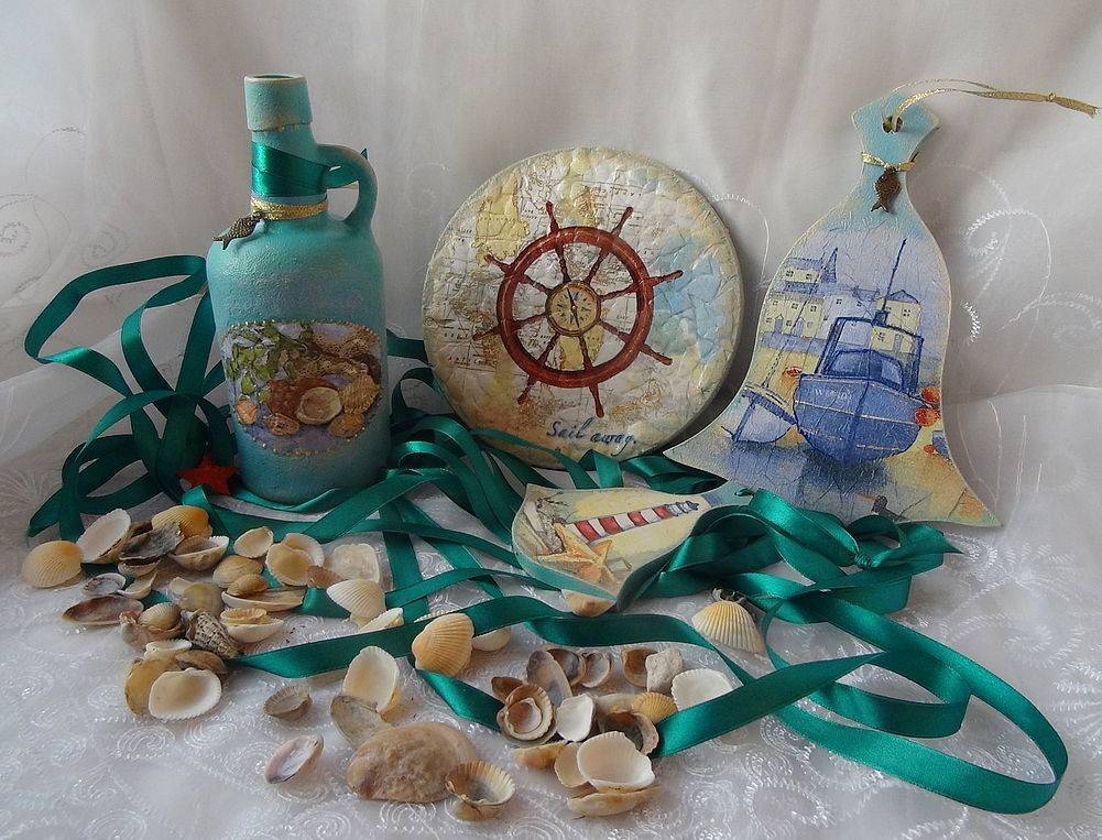 в качестве аксессуаров, как правило, используются натуральные раковины, мелкие камушки, канаты, плетеные корзины и т.п.