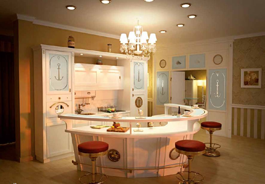 План кухни в морском стиле использует различные варианты размещения мебели: вдоль одной или двух стен, в углу или по прямой линии и самый «морской» способ обустройства кухни — «остров».
