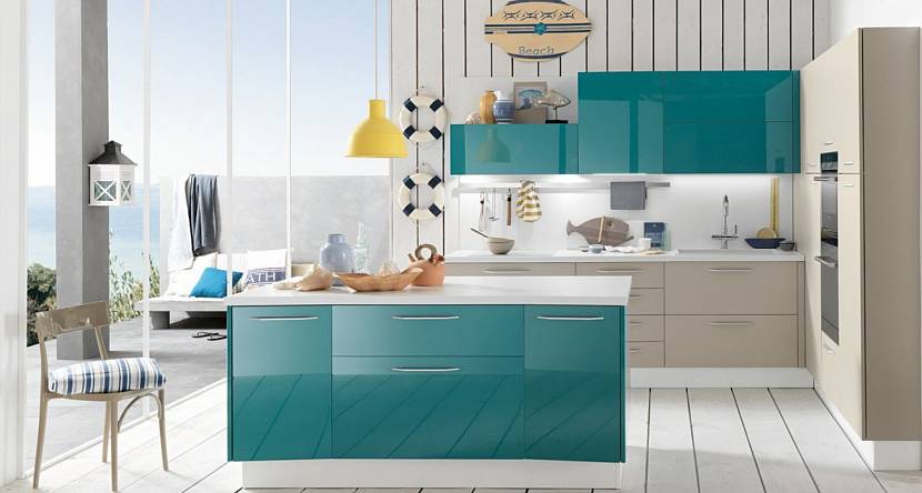 Привлечь внимание к гарнитуру реально несколькими способами. Например, скомбинировав разные материалы на фасадах и поверхности, встроив стекло в дверцы на верхнем уровне, приклеив тематические картинки или ракушки по периметру, а также выбрав насыщенный тон для мебели