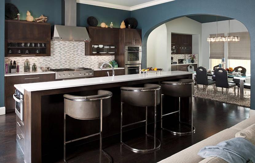 Хотите выполнить зонирование интерьера? Разделите пространство островной стойкой, популярной во многих стилевых направлениях. Интересно будет смотреться остров, стилизованный под лодку. Его можно использовать во время готовки, а также задействовать в роли обеденного стола.
