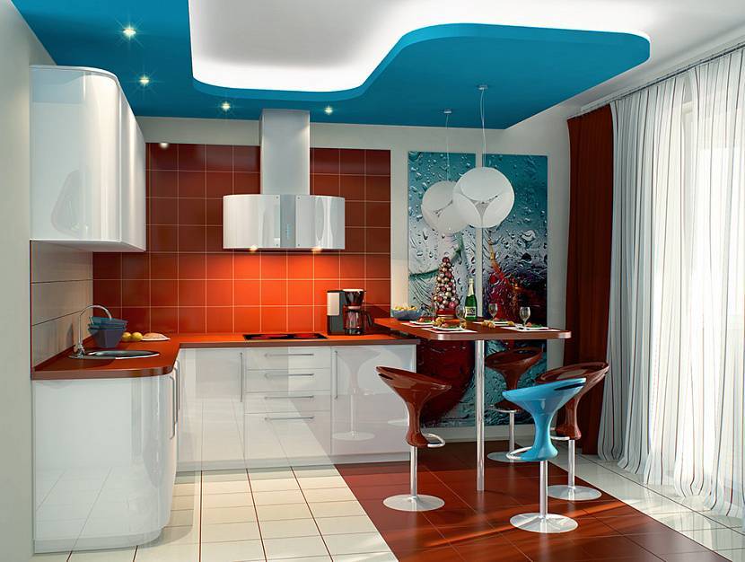 Эта плоскость находится наверху, поэтому не всегда заметна, однако такое ее качество чаще всего вызвано удачным выбором цветового оформления. Гораздо сложнее сделать привлекательным потолок темного цвета. Поэтому не стоит использовать насыщенную морскую волну в этой области интерьера, если нет уверенности в результате.