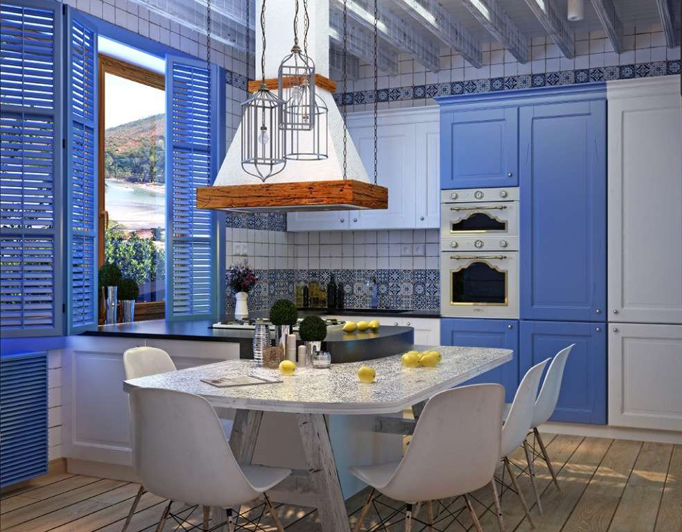 Потолочные балки на кухне в средиземноморском стиле стильно смотрятся в синем цвете