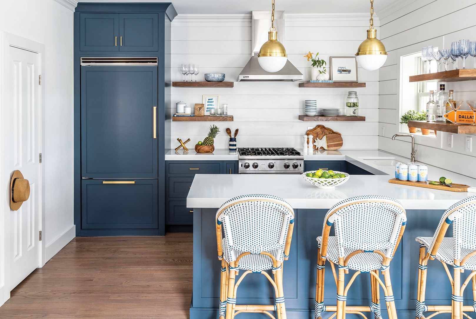 Более современный вариант оформления кухни выглядит запоминающимся благодаря использованию насыщенного голубого цвета.