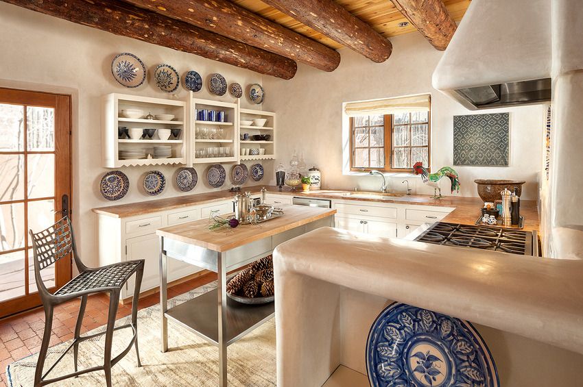 На кухне в средиземноморском стиле, помимо стандартных автономных предметов мебели рабочей зоны будут уместно смотреться такие элементы, как: