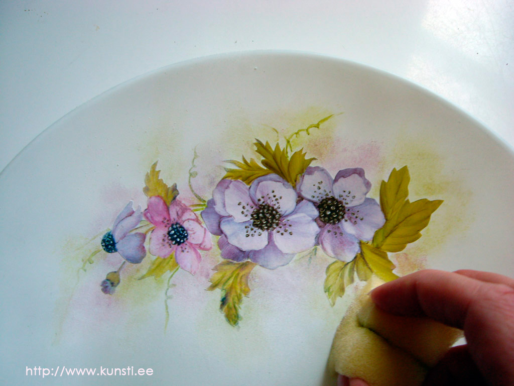 Пройтись по краю наклеенного фрагмента поролоновым спонжем белой акриловой краской постукивающими движениями. Дать краске просохнуть. Покрыть всю внутреннюю поверхность тарелки лаком. Оставить до полного высыхания. Покрыть лаком обратную сторону тарелки. Оставить до полного высыхания. Тарелка готова.