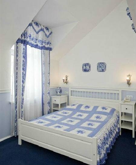 В спальне шторы, покрывала и комплекты белья с узорами гжели помогут оформить помещение в традиционном стиле и придадут ощущение легкости и воздушности.