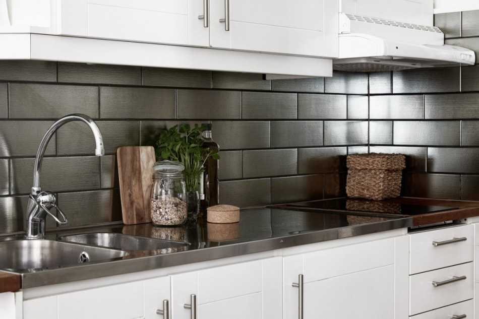 Фартук. Традиционным решением для лофта считается кирпичная кладка, ее имитация или плитка в форме прямоугольника. Также в облицовке применяют материалы, воспроизводящие фактуру дерева или металла. Рабочую стенку можно декорировать стальными панелями или закаленным стеклом.