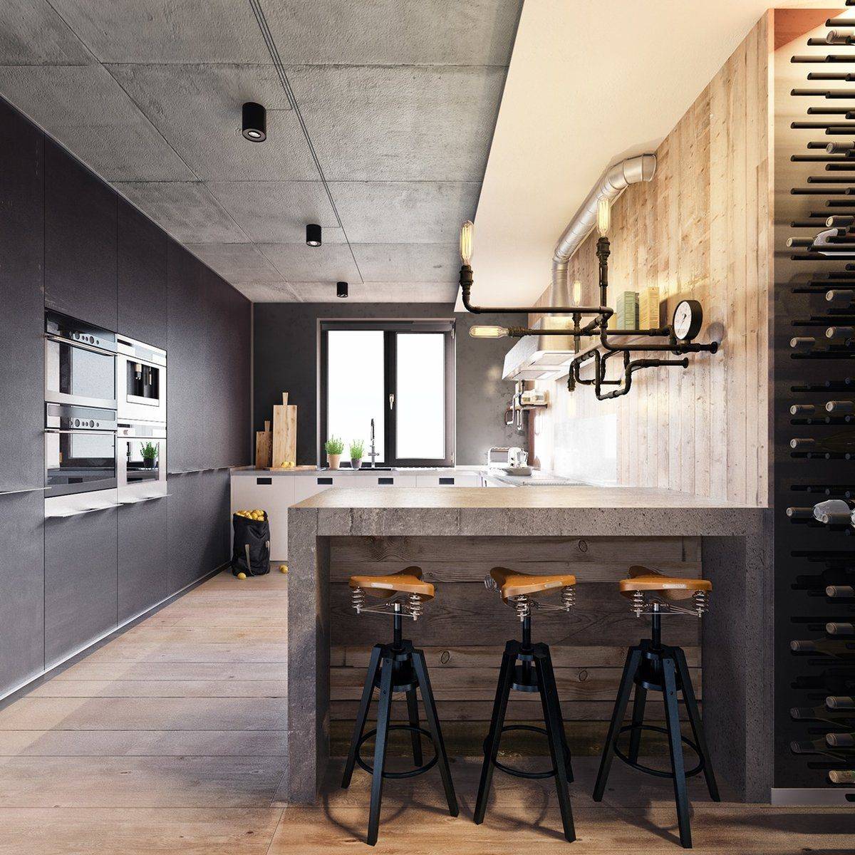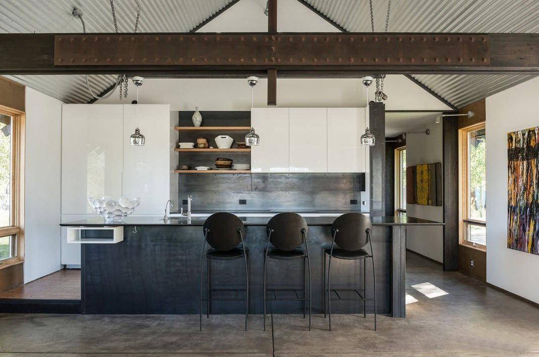 На фото бетонный потолок, декорированный балками из темного дерева, подчеркивает общее направление лофта на кухне.