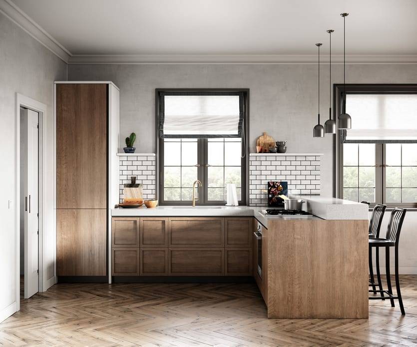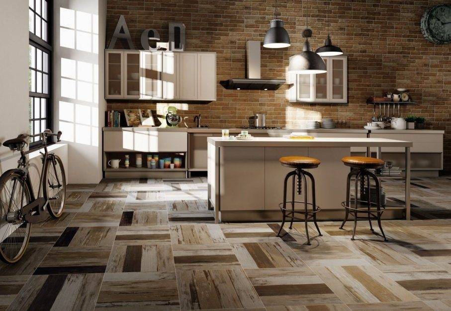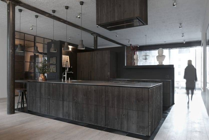 Для оформления стен и пола на кухне часто используют дерево. Также деревянная отделка может встречаться в базовой меблировке или на потолке. Для лофта наиболее уместно применение твердых сортов древесины с состаренной текстурой, подчеркивающей аутентичность обстановки.