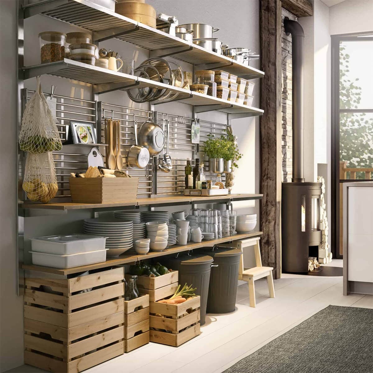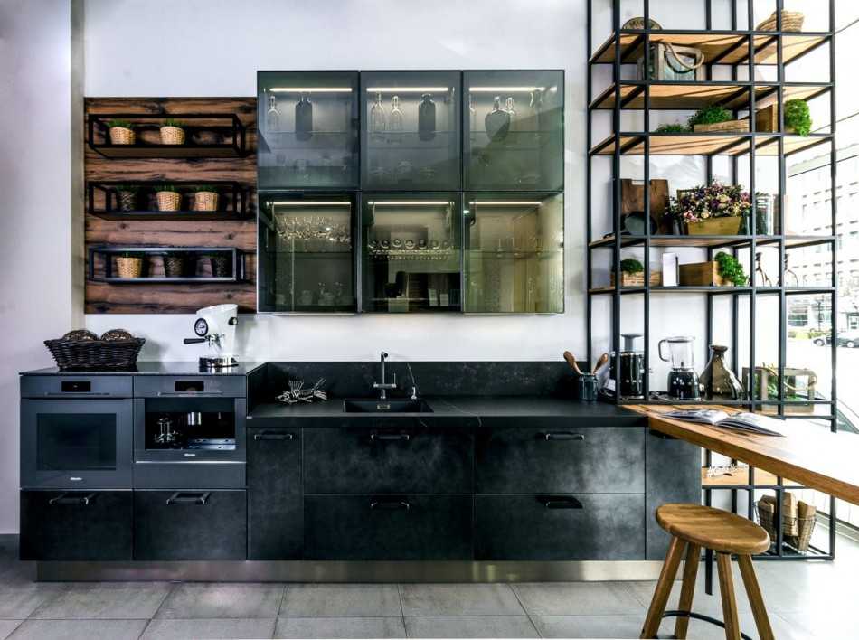 Выбор промышленного стиля означает использование контраста между закрытыми шкафами и открытыми стеллажами. Маленькое пространство и вкус к необычным украшениям определяет открытый вид хранения. Это могут быть кованые панели, открытые стойки и полки для лотков. Продумайте хранение того, что должно быть скрыто от глаз, в незаметных зонах.
