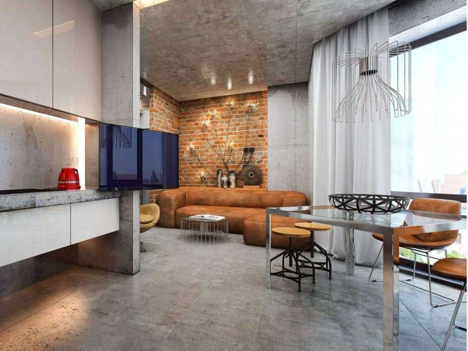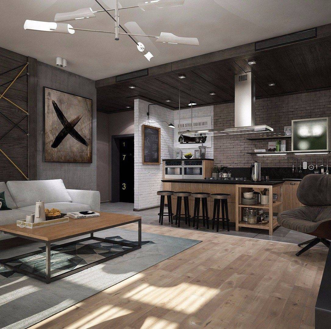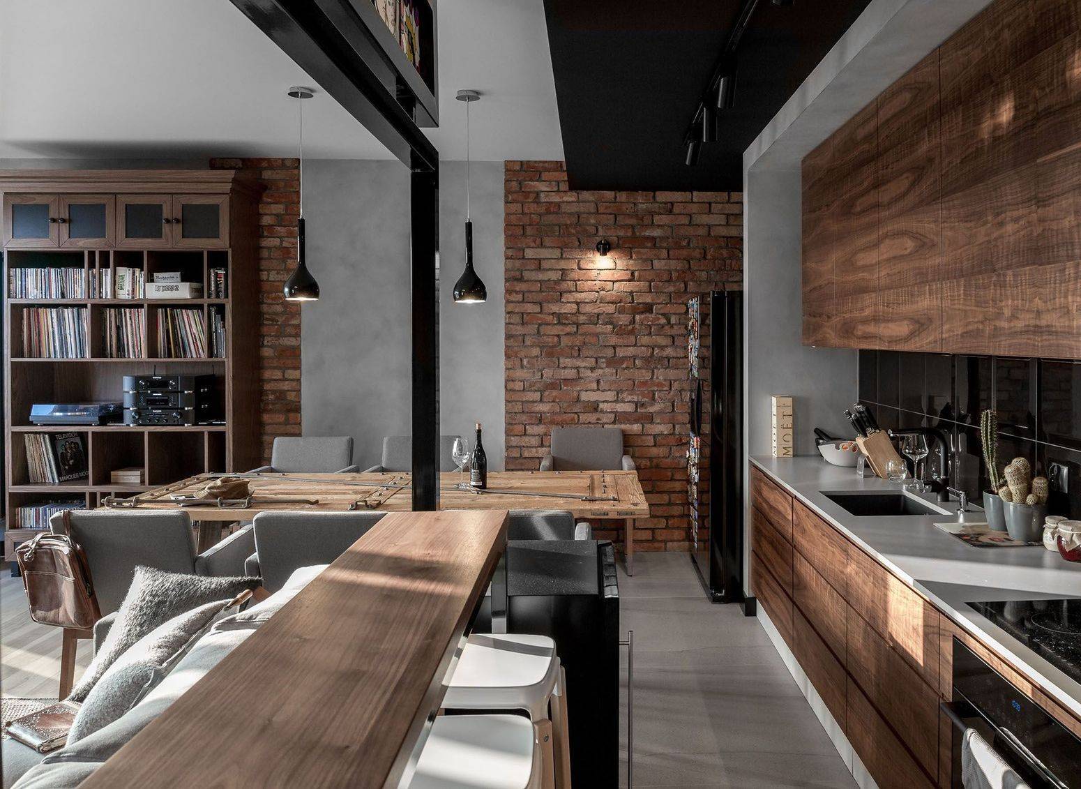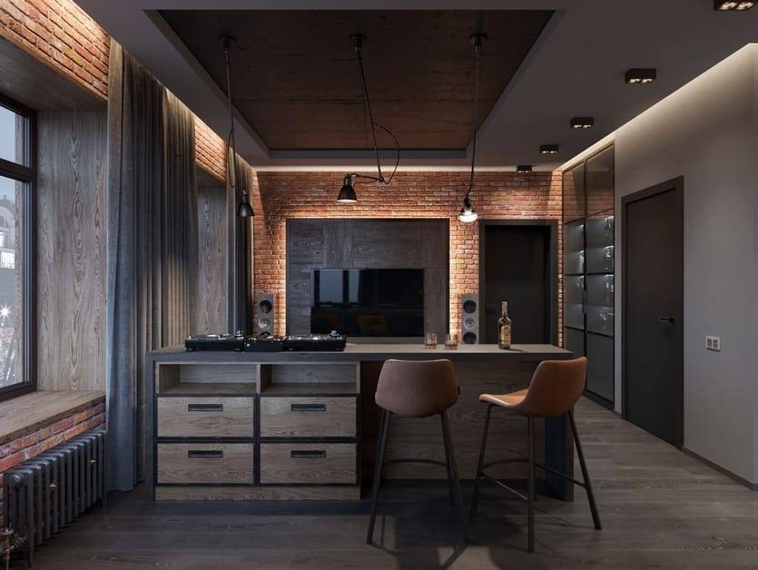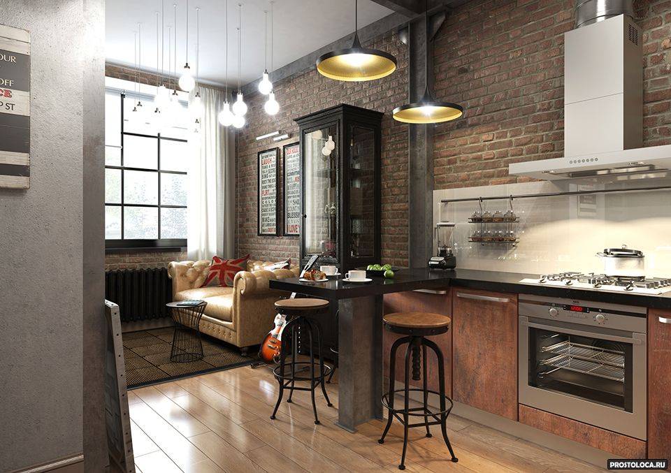 Если кухня объединена с гостиной, хорошим вариантом станет массивная барная стойка, отделяющая зоны, модульный диван обивкой из кожи или грубой ткани.