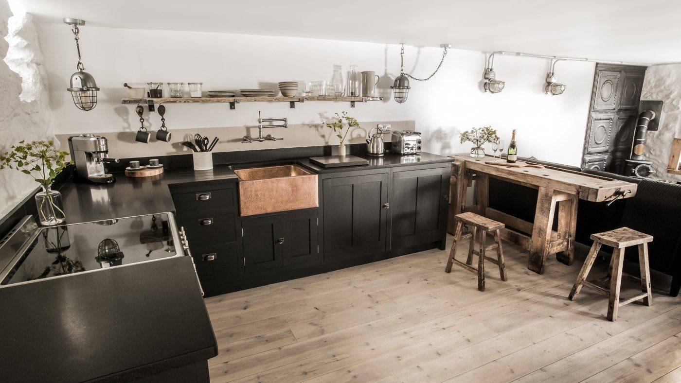 Чем грубее будет исполнение деревянных фасадов кухни, тем органичнее она будет смотреться. Это могут быть как фасады из натурального материала, так и изделия из МДФ и ДСП, имитирующие необработанную или же старую древесину. Эффект потрескавшейся или выгоревшей краски на фасадах подчеркнёт стиль. Предпочтительна фурнитура из прозрачного пластика и матовой стали.