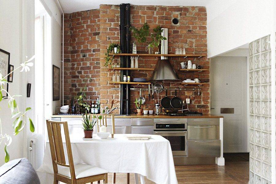 Хорошее решение — побеленная кирпичная кладка с акцентом — кухонным фартуком контрастного цвета.