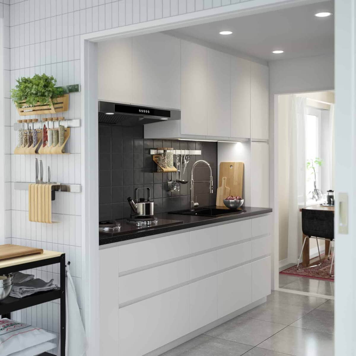 Белая мебель с контрастными чёрными столешницами визуально расширяет площадь и выглядит супер эффектно.