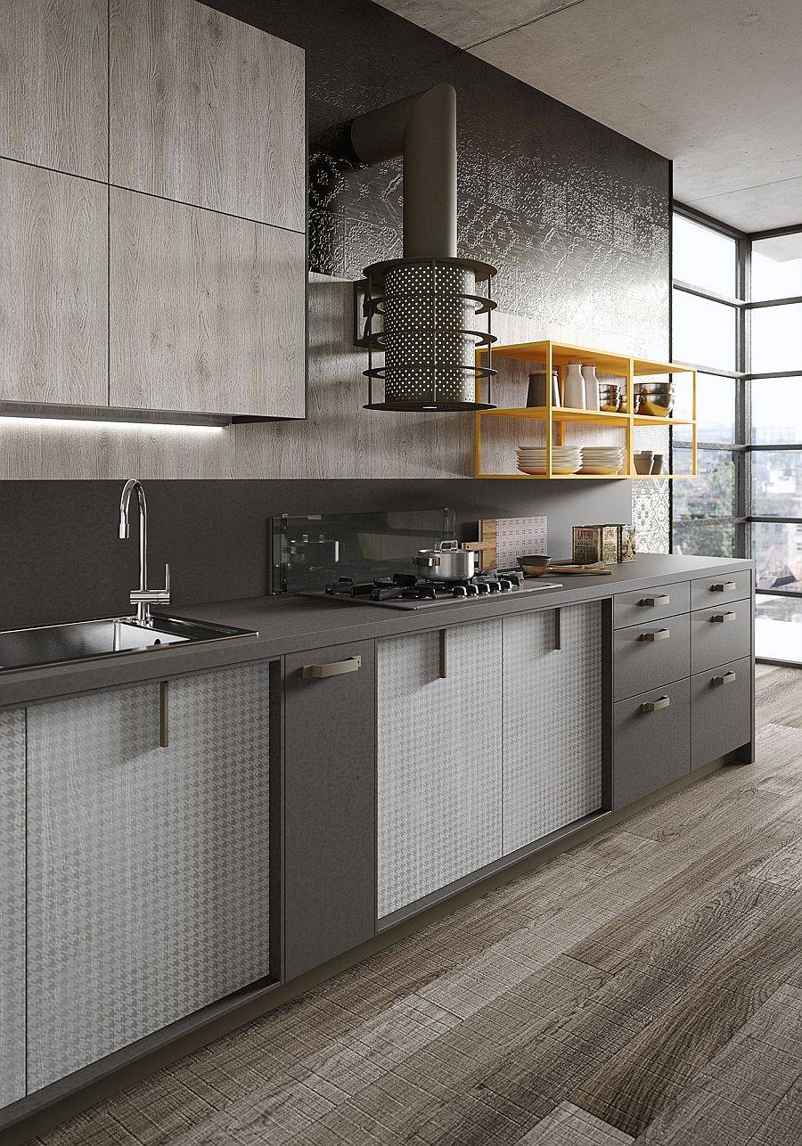 Соседство различных текстур и даже материалов придадут интересный вид – их можно комбинировать в одном кухонном гарнитуре, соединив, например, фасад шкафов из дерева и бетона. Сделайте деревянный гарнитур с отделкой из олова. Любые металлические детали дают графически поразительный эффект – где же его использовать, если не на кухне? Например, сделайте открытые полки с оловянной отделкой или лакированной алюминиевой рамой и поставьте на них оловянную посуду.
