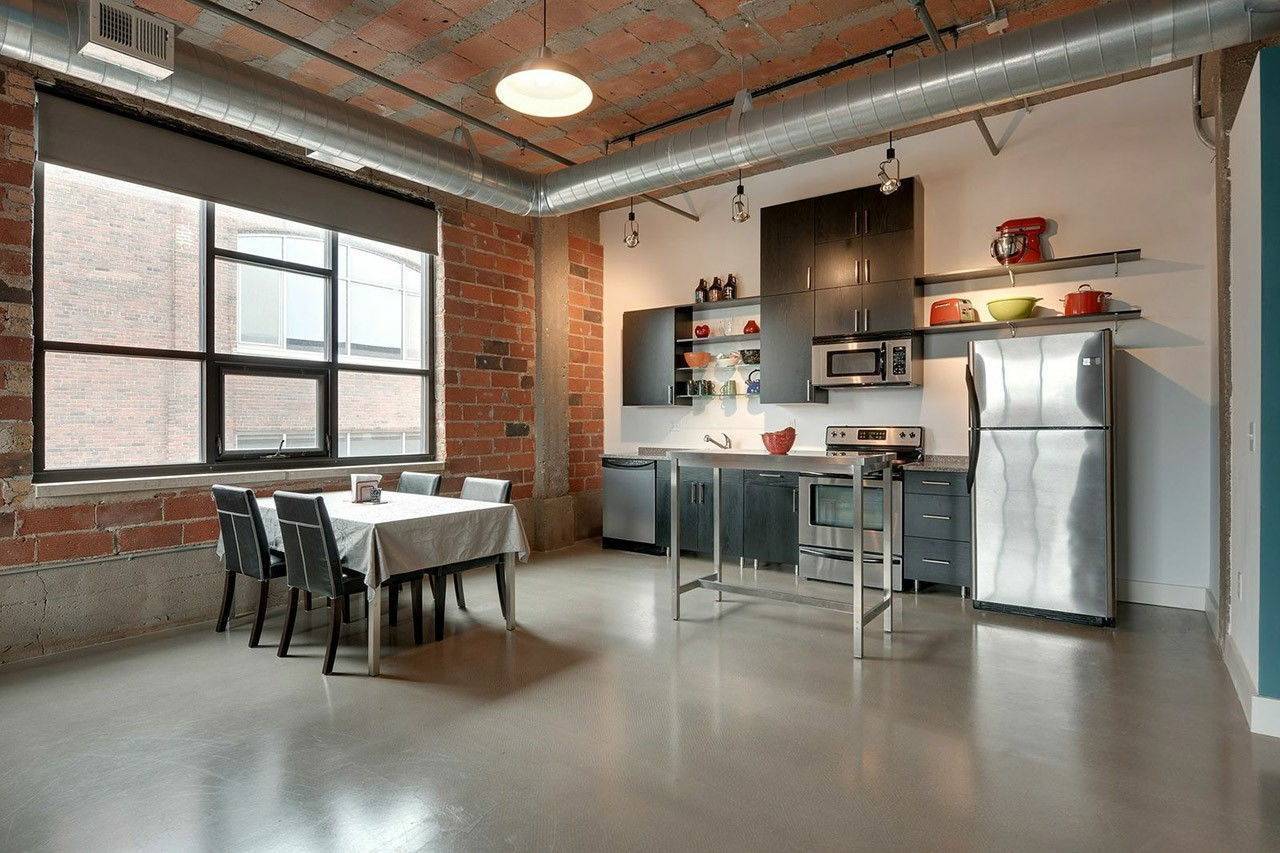 Стены. Индустриальный дизайн предполагает наличие голых красных, белых, серых, черных кирпичных стен, бетонных или каменных плоскостей. Вполне возможно применение имитации, которую поможет создать плитка, пластиковые панели или обои.