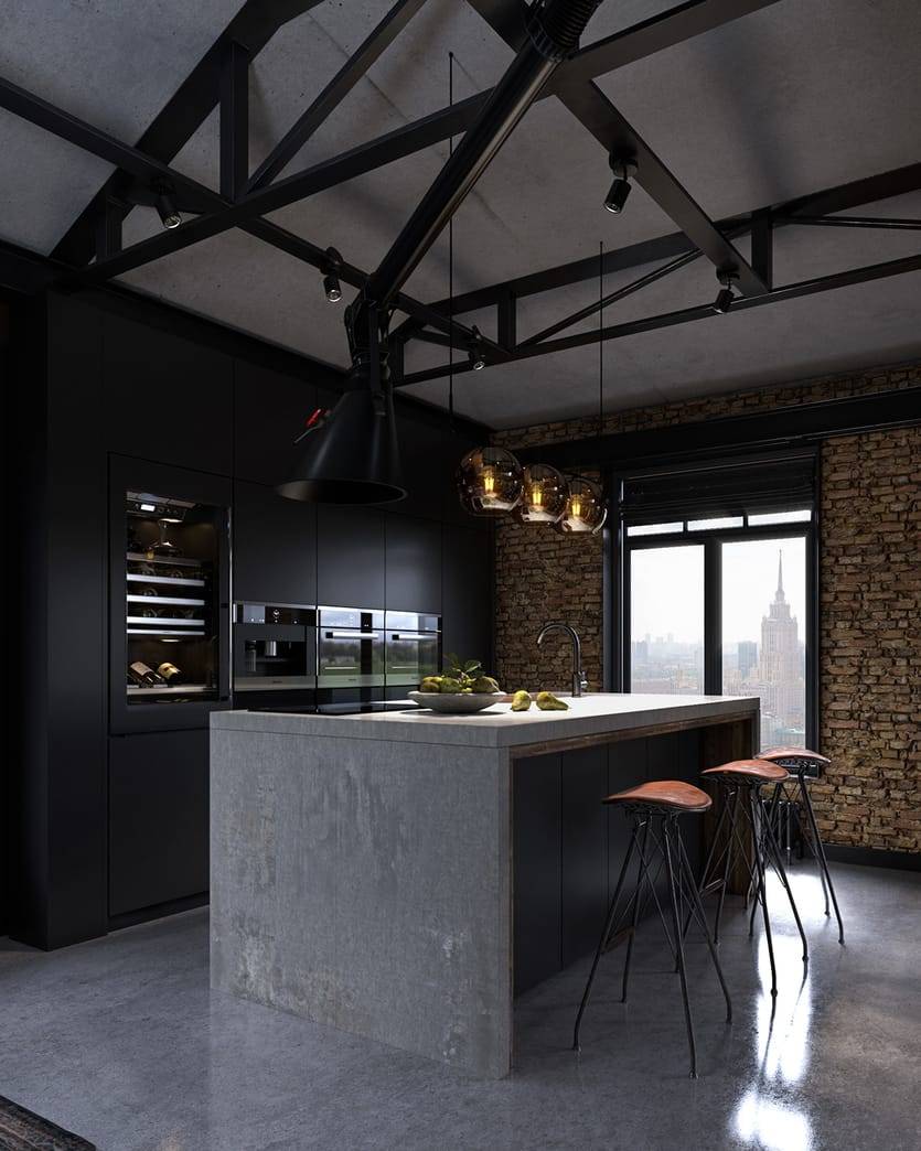 На фото бетонная отделка стен поддерживает идею лофта гармонично сочетается с черной матовой плиткой под кирпич.