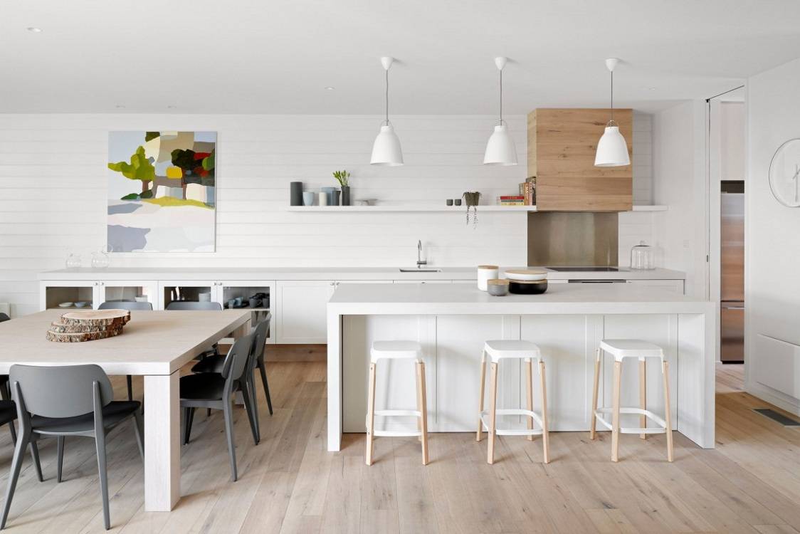 Обеденный стол для такой кухни может быть и легким, и массивным — главное, чтобы его дизайн был минималистичным. Для изготовления столешницы можно использовать самые разные материалы: натуральное дерево, закаленное стекло, ДСП, МДФ.