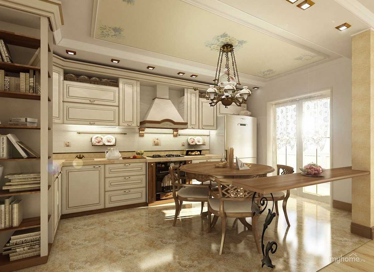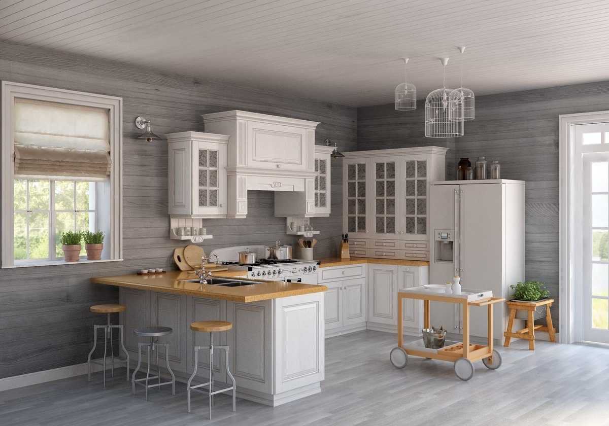 Кухня в данном направлении выполняется с применением в отделке керамической плитки с рисунками. Помещение должно быть хорошо освещено, чтобы каждая деталь наполнялась солнцем. Меблировка нужна из дерева светлых тонов, местами потерта, выщерблена, с эффектом художественности. Особое место уделяется печке, ее декорируют подходящим способом. Посуду не прячут, а ставят на открытые полочки, добавляя элементы старины, например, фарфоровые блюдца или фигурки, прозрачные баночки со специями и маслом, старинные предметы обихода. На стенах уместны тарелки с французской росписью, романтические натюрморты, декоративное панно. Фурнитура выбирается без блеска, приближенная к старинной.