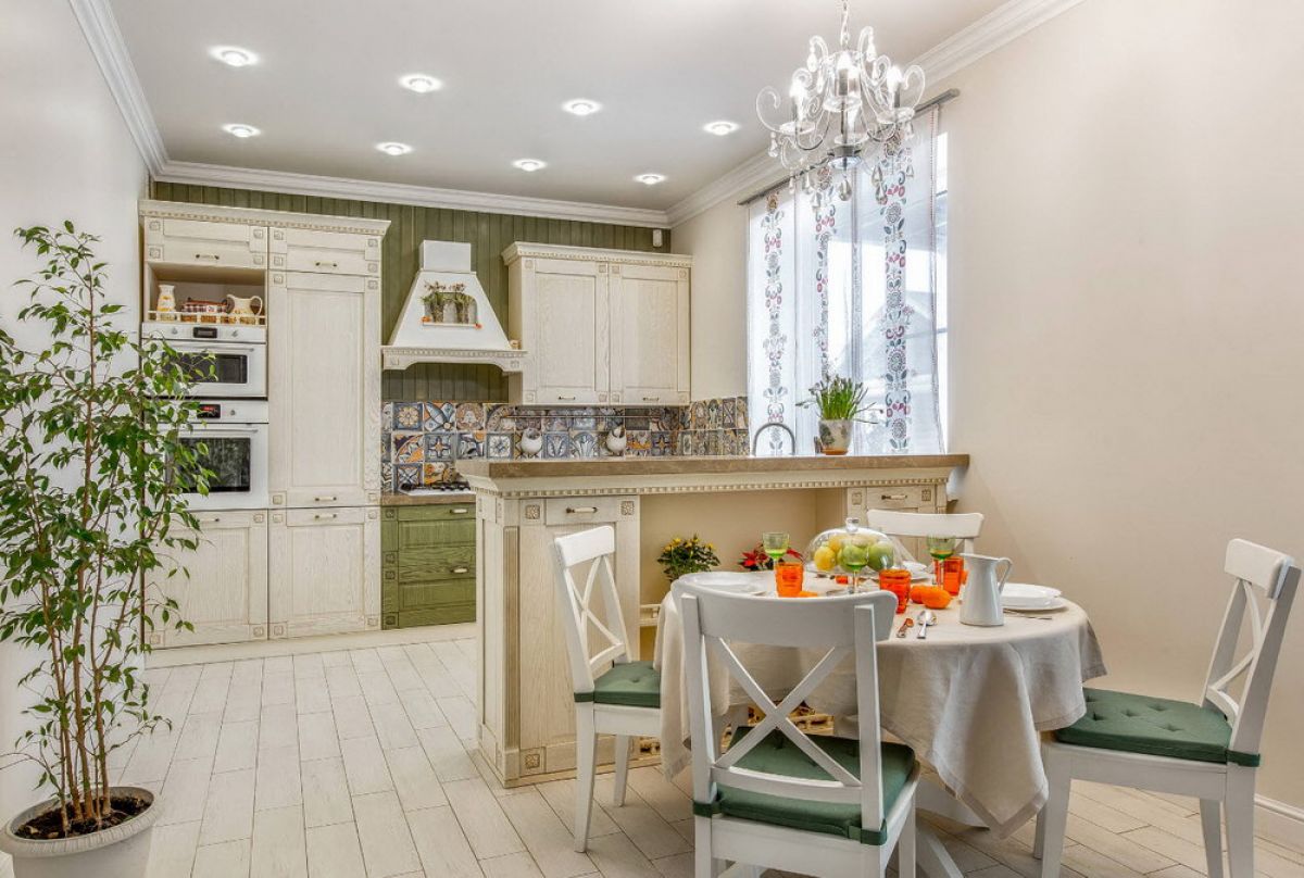 Кухня в данном направлении выполняется с применением в отделке керамической плитки с рисунками. Помещение должно быть хорошо освещено, чтобы каждая деталь наполнялась солнцем. Меблировка нужна из дерева светлых тонов, местами потерта, выщерблена, с эффектом художественности. Особое место уделяется печке, ее декорируют подходящим способом. Посуду не прячут, а ставят на открытые полочки, добавляя элементы старины, например, фарфоровые блюдца или фигурки, прозрачные баночки со специями и маслом, старинные предметы обихода. На стенах уместны тарелки с французской росписью, романтические натюрморты, декоративное панно. Фурнитура выбирается без блеска, приближенная к старинной.