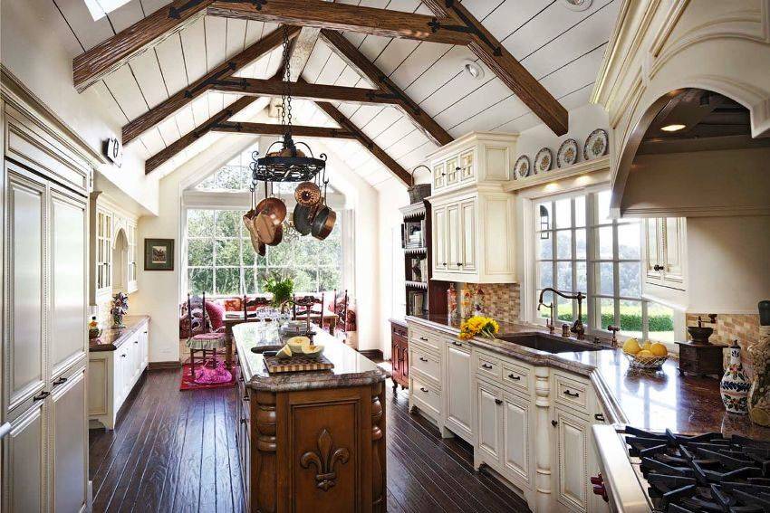 Потолок лучше всего оставить белым – покрасить или побелить. Если есть желание внести разнообразие в белое пятно над головой и усилить эффект деревенского колорита, добавьте грубых деревянных балок над головой.