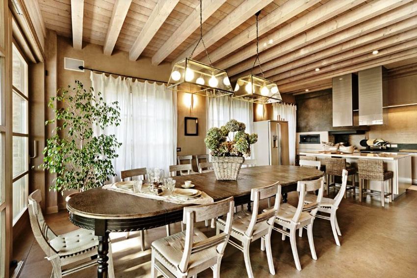 Хорошим решением станет потолок с открытыми деревянными балками. Он создаст ощущение природного простора. К потолку можно прикрепить люстру с тяжелыми цепями либо лампочками в виде свеч.