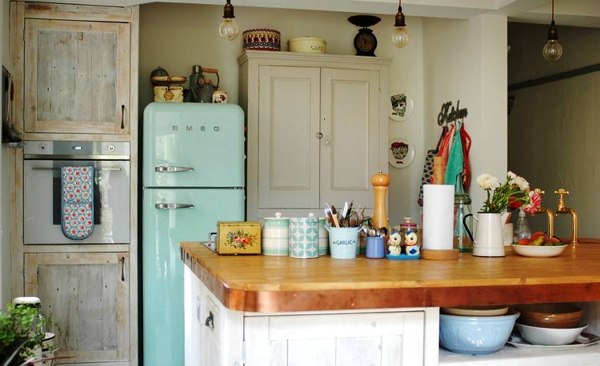 В этом стиле можно смело выставить напоказ красивые, полезные или просто милые сердцу мелочи. Прихватки, баночки для специй, статуэтки, изящные вазы – все это только добавит уюта и создаст подходящую атмосферу.