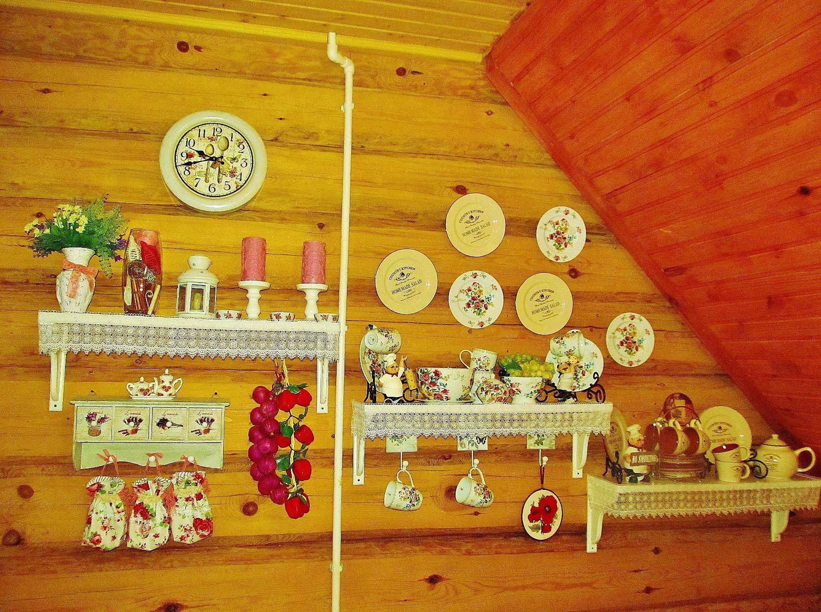 Кроме того, для украшения стоит использовать расписные сервизы. Рисунок на керамике все тот же: цветы или птицы. Гармонично будут выглядеть тарелки с вытертыми, неяркими картинками. Такие можно найти в антиквариате.