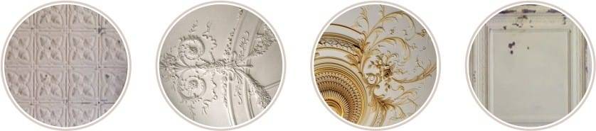- применение в декоре стен и потолочной поверхности лепнины, плинтусных конструкций, розеток, окружающих светильник на потолке;