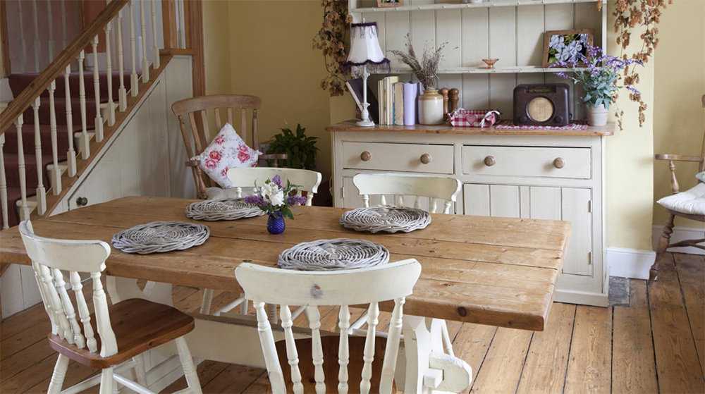 Мебель следует использовать в светлых тонах, но будет лучше, если кухонные столешницы останутся деревянными. Если у вас есть фарфор, который вы унаследовали от бабушки, не забудьте показать его. Благодаря этому, он станет не только полезным кухонным оборудованием, но и отличным украшением. Что еще нельзя пропустить: