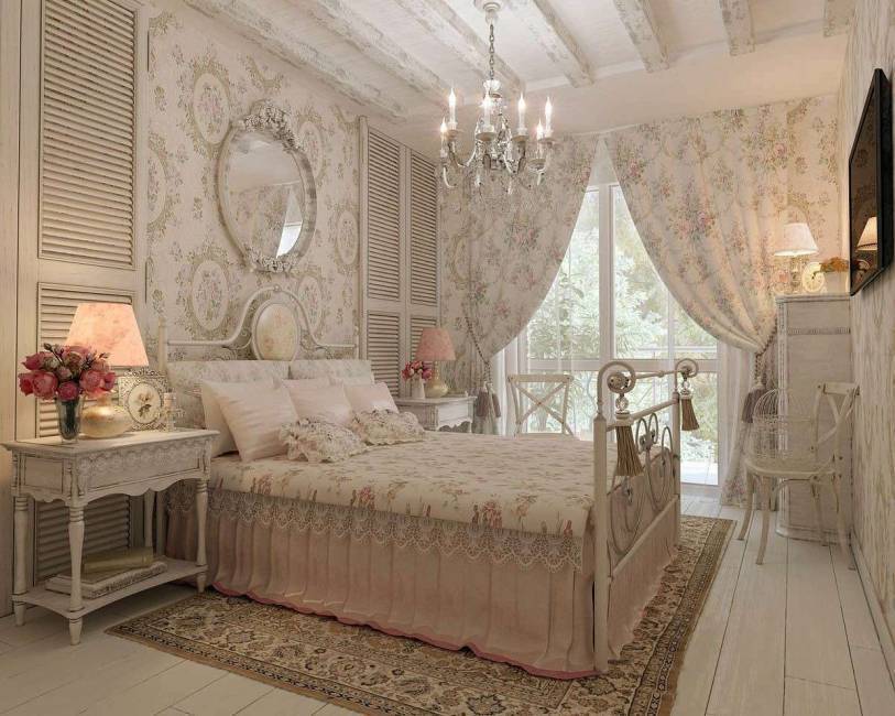 - Обои. Желательно, чтобы они напоминали обычные обои из бумаги, с мелким узором из роз. При этом на самом деле это должны быть либо обои со стеклом, либо флизелиновые обои, иначе менять их придется всего через пару лет.